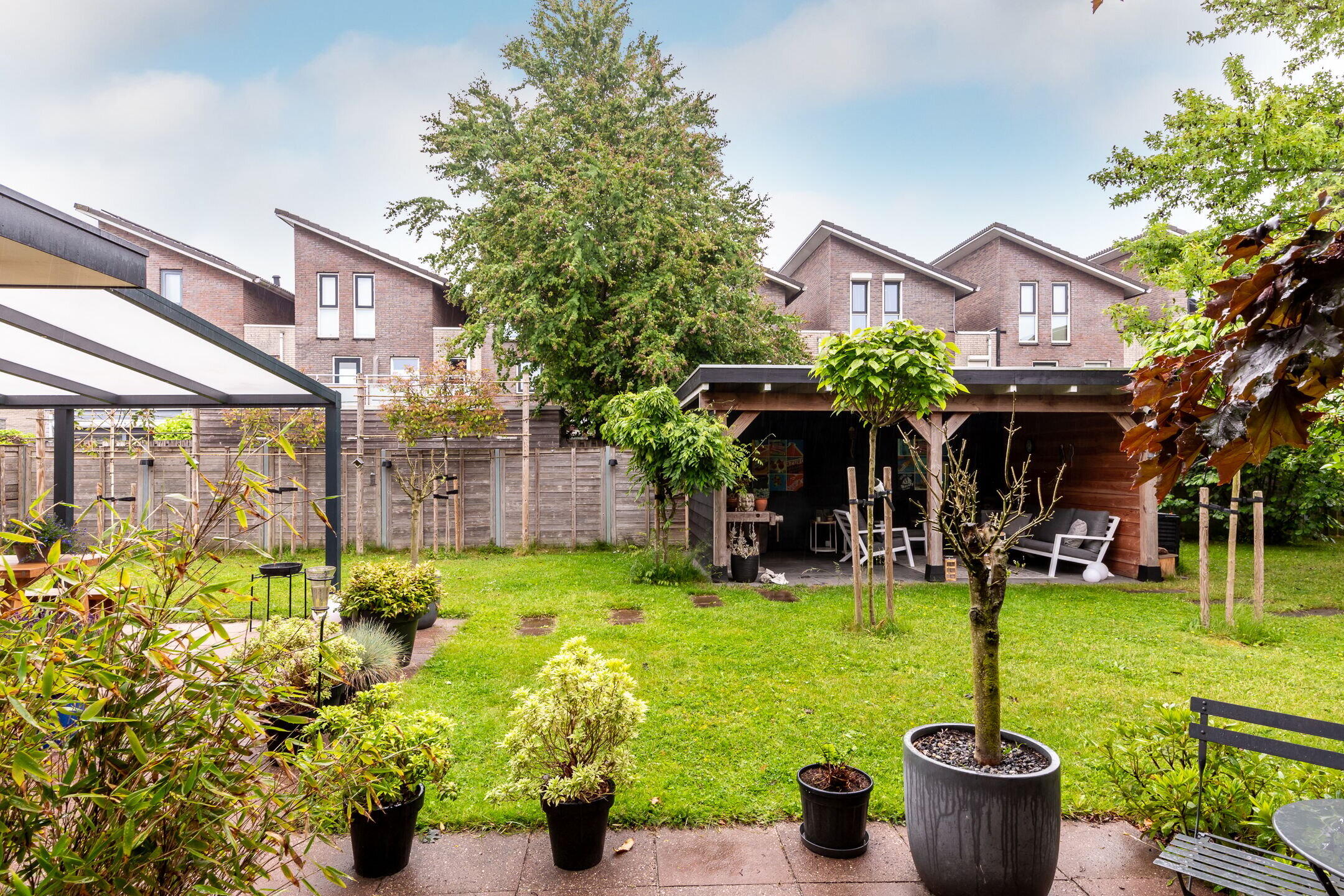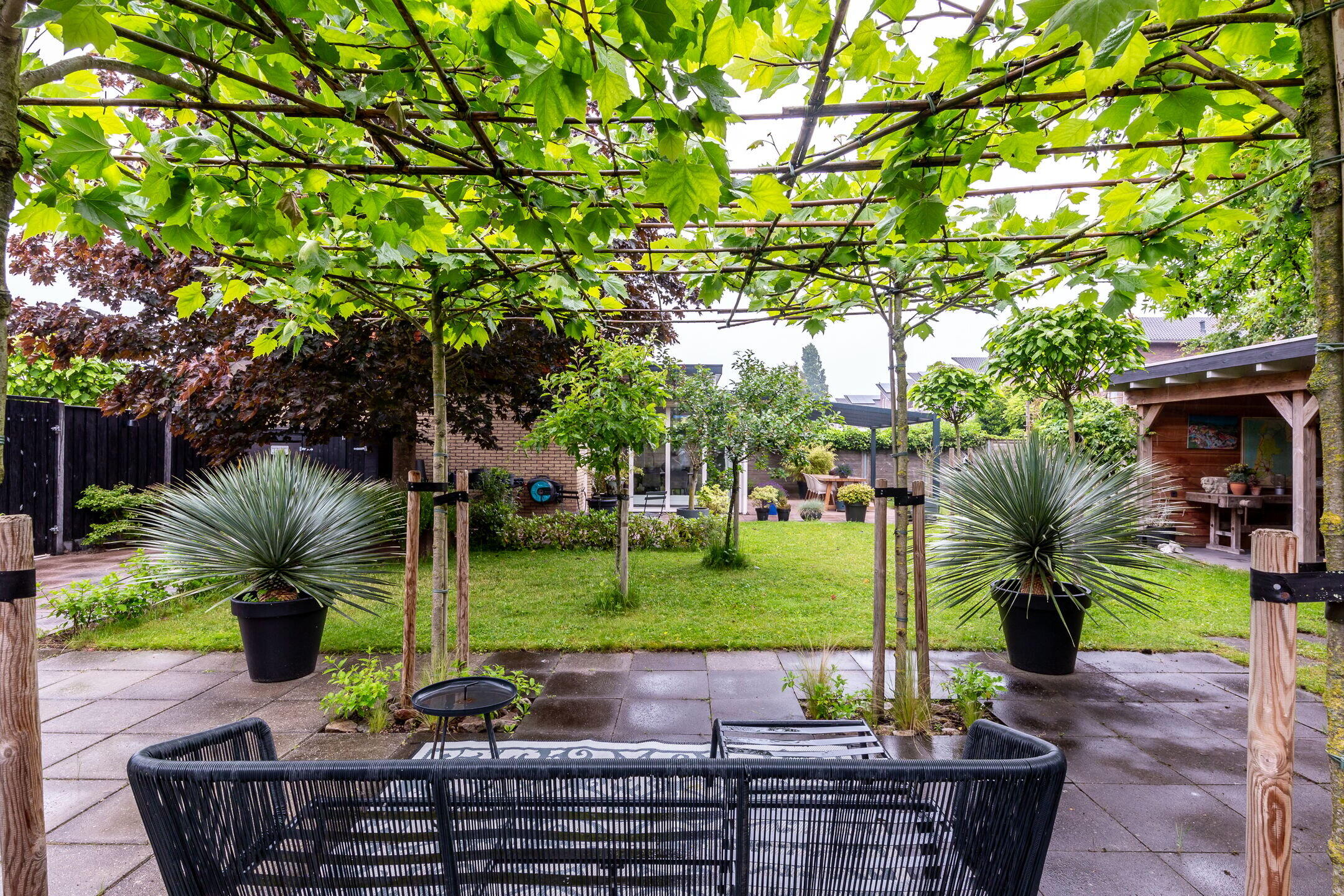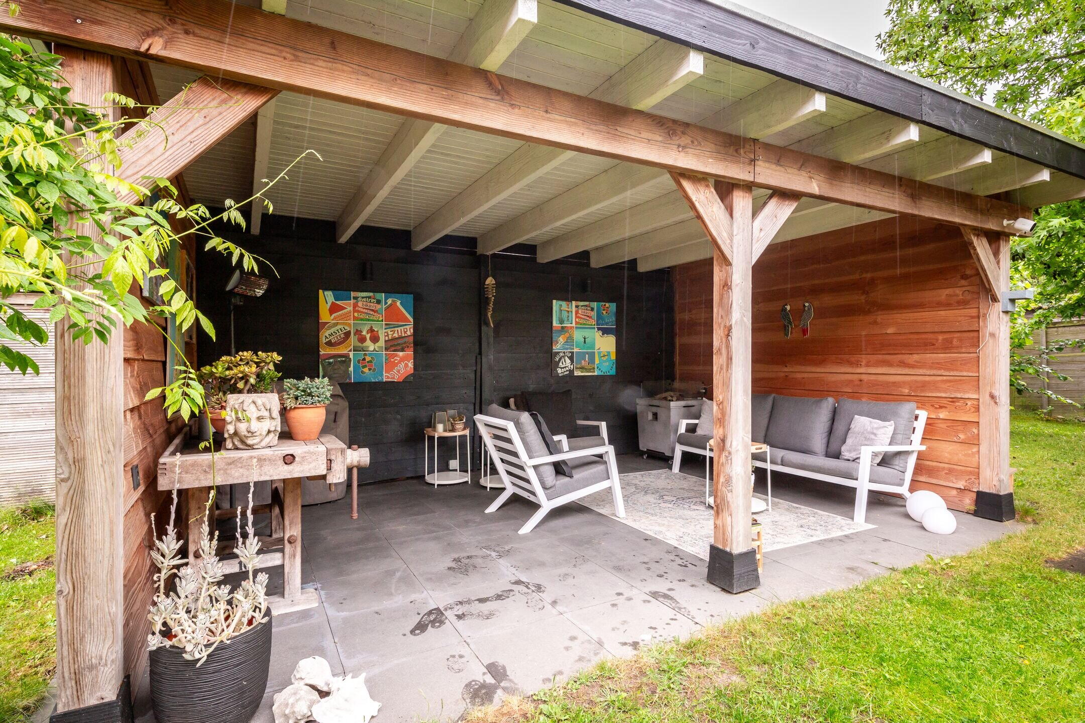 • Heerlijke zeer riante tuin rondom beschikt over meerdere parkeerplaatsen op eigen grond, een fraaie houten overkapping (geplaatst ca. 2013) en een separate houten schuur/berging